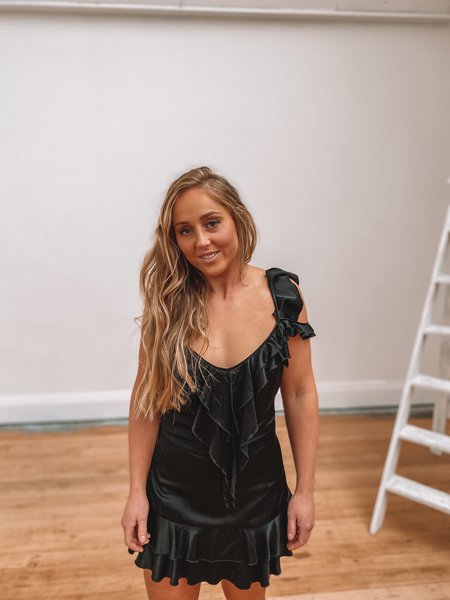 A sleek little black dress, featuring an open back with intricate ruffle straps, ruffle detail on the front and a frill hemline on the skirt.
