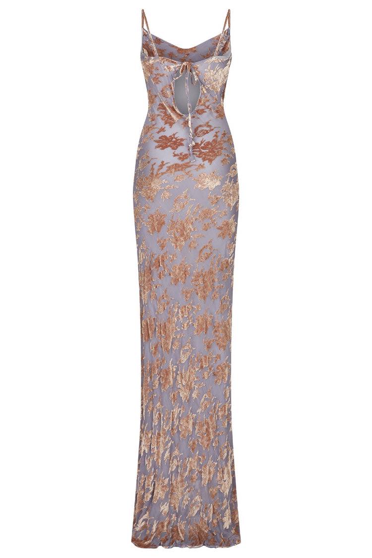 A beautiful full length and figure hugging gown with a small train, a cowl neck at the front across the bust and a small open back, in a crushed velvet fabric floral motif. This dress is fully lined with a silk slip.
