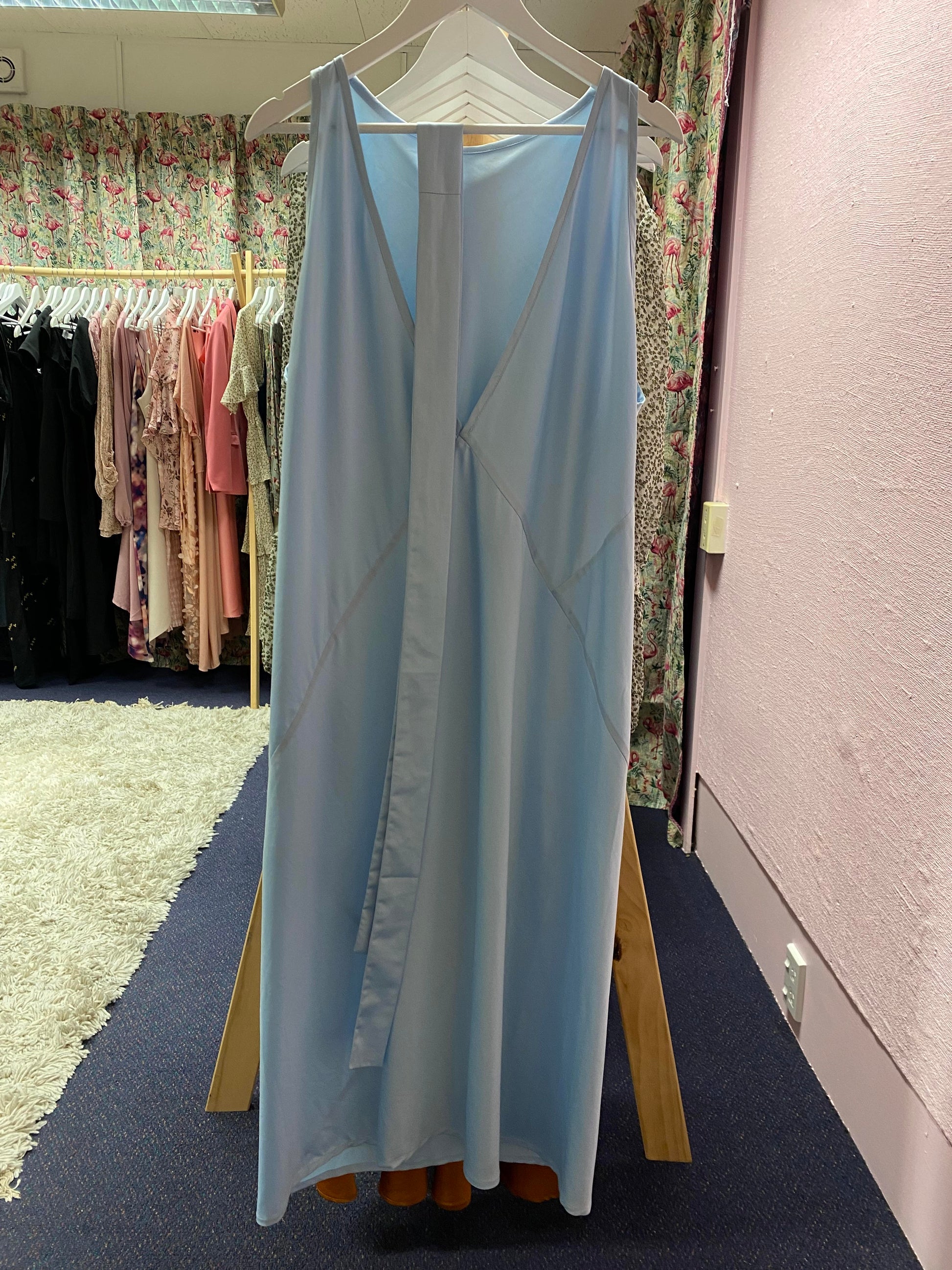 A beautiful silk slip dress designed to fit and flatter a range of sizes, this dress comes in a light blue. It can be worn a variety of ways and comes with a separate waist tie. Please note photo on model is the same dress in a different colourway.