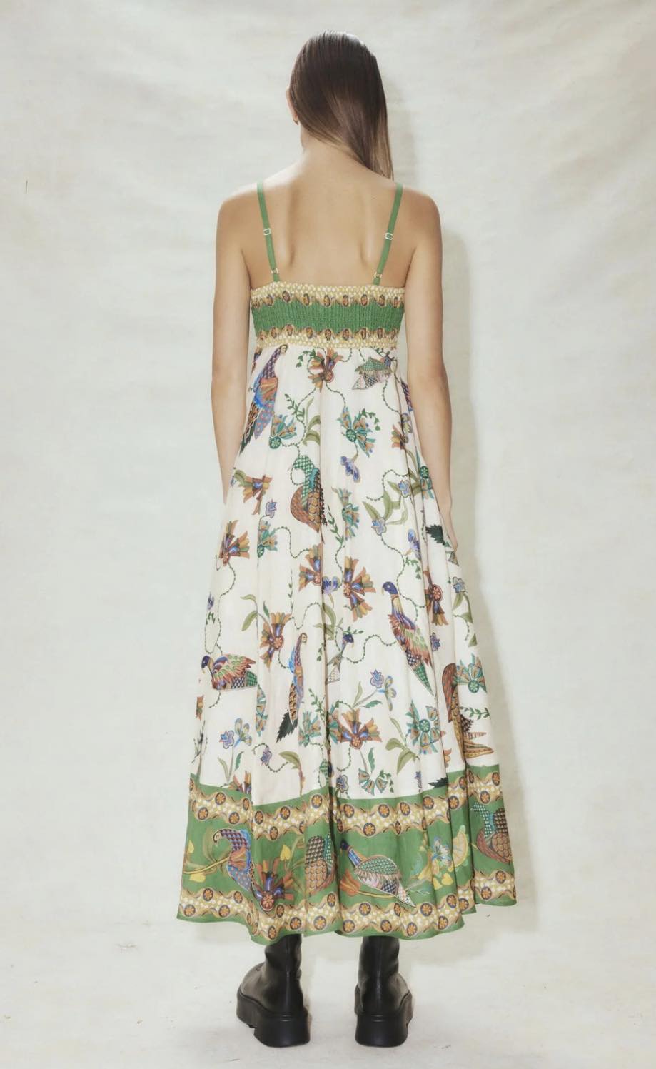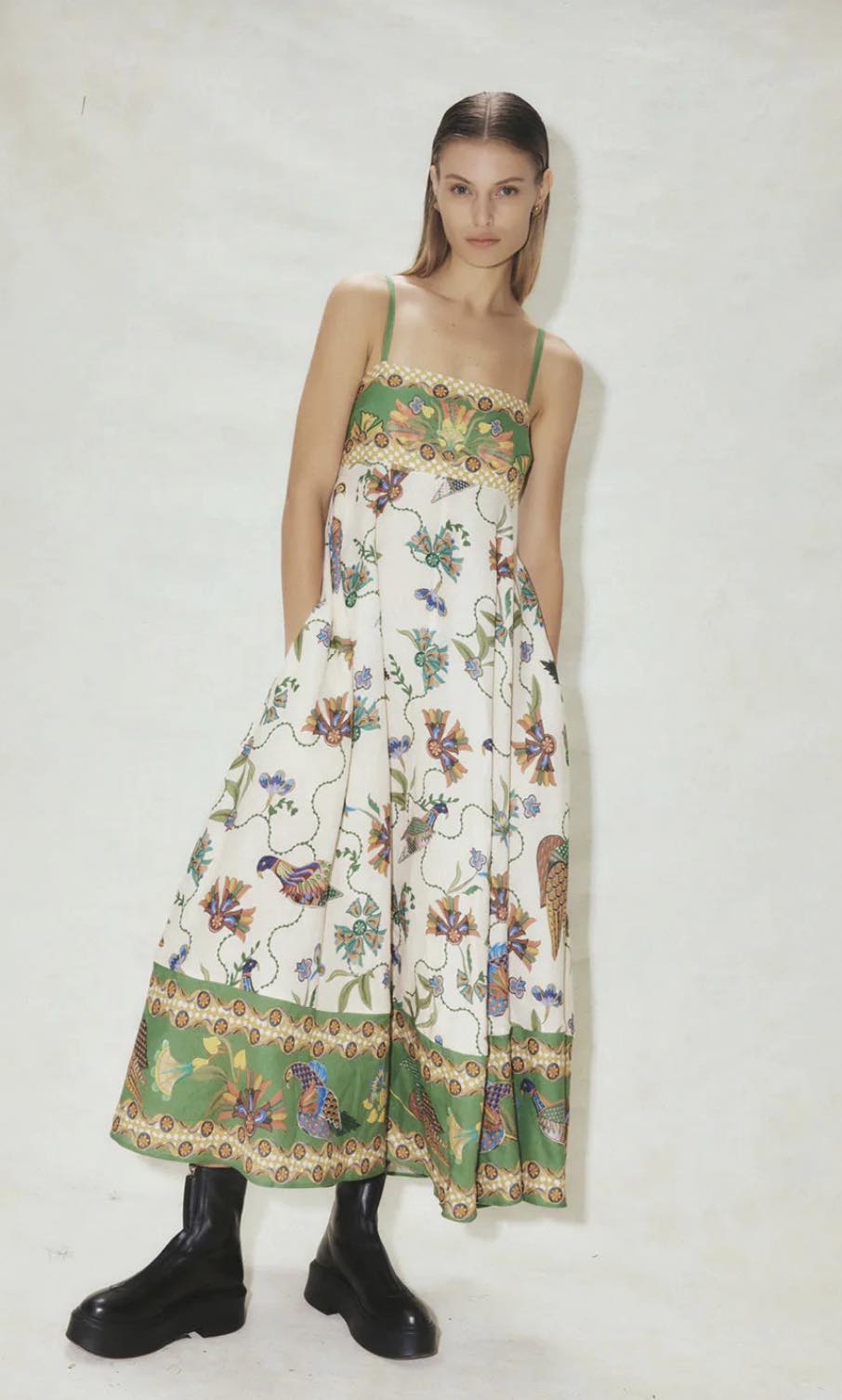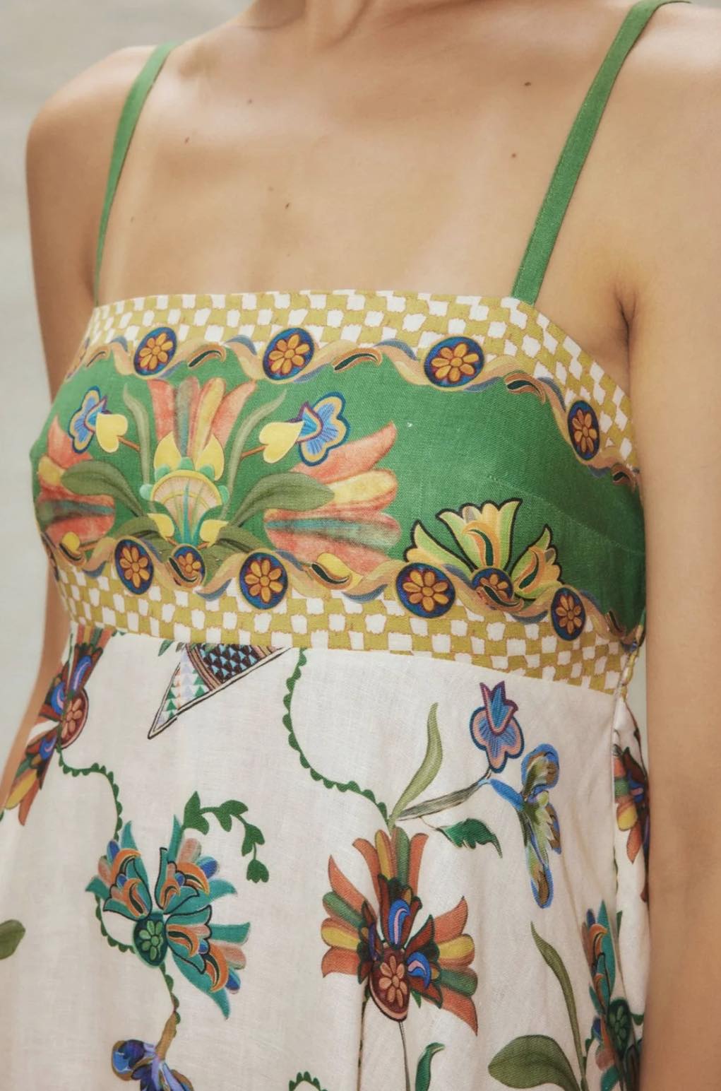 A chic sundress in signature Alemais print. This piece features a fitted bandeau style bodice, adjustable straps, and a shirred panel on the back, with the skirt cascading from under the bustline.