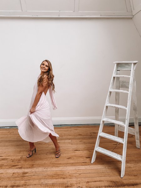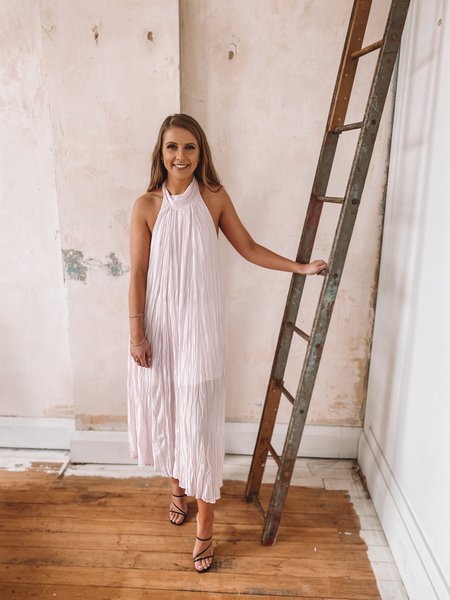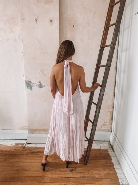 A special piece. The Cascade Crush Gown is a halter neck dress with a flowing midi length skirt. An elasticated waistline around the low back makes it a very flattering and free fitting piece that will suit a range of sizes. This dress is lined.