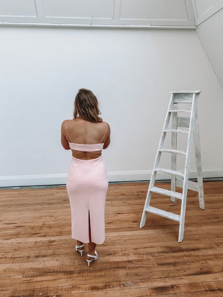A beautiful midi by Bec & Bridge. Features shoestring straps, centre back split, a simple straight neckline and v waist cut outs. This dress has been pinned on the model shown in photos, it will fit a size 14 and is designed to be a flattering figure hugging fit.