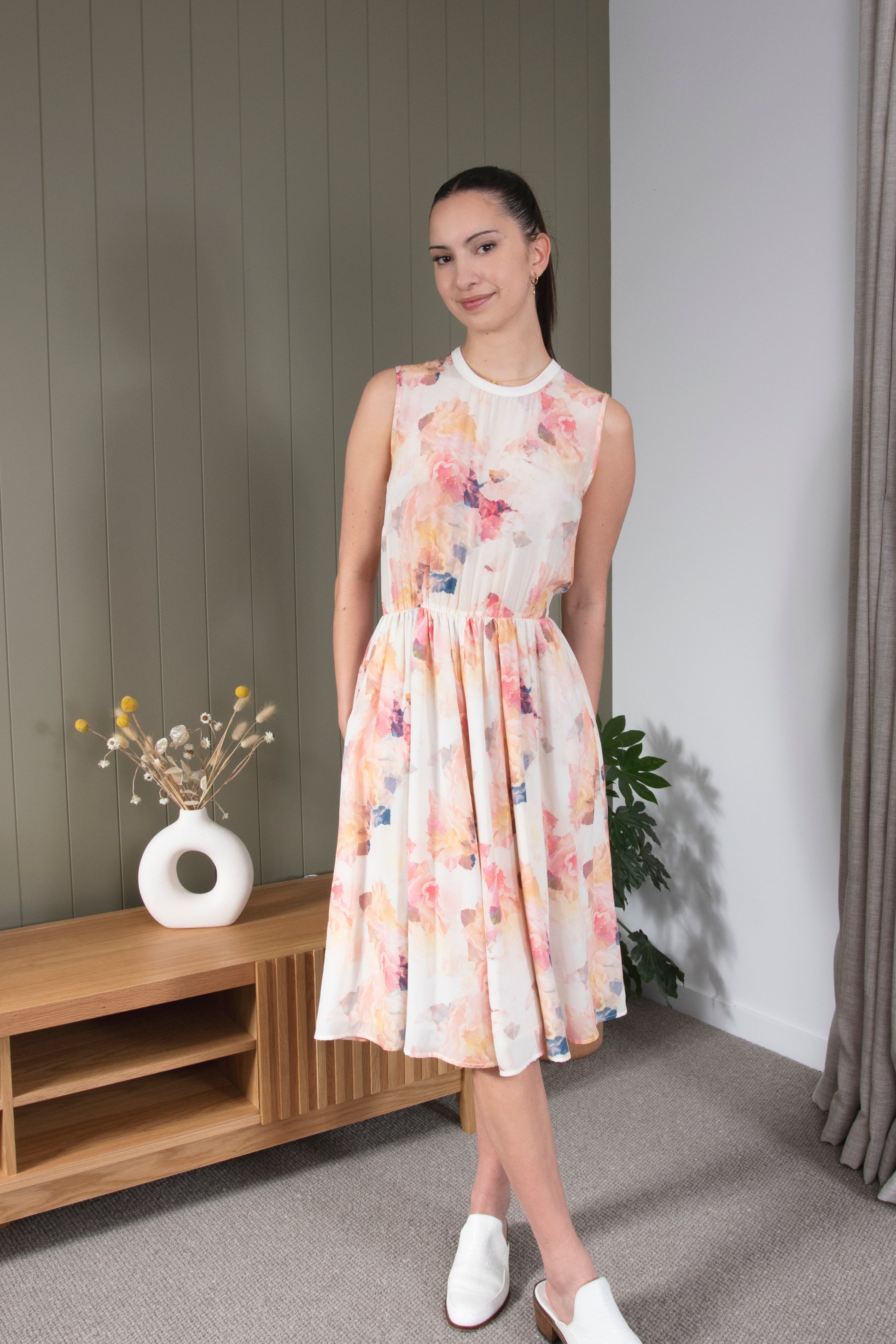The Freya dress is a lovely feminine frock in Juliette Hogan's 'Summer Rose' print. This dress features a lined skirt and open split back. The top is unlined and slightly sheer.