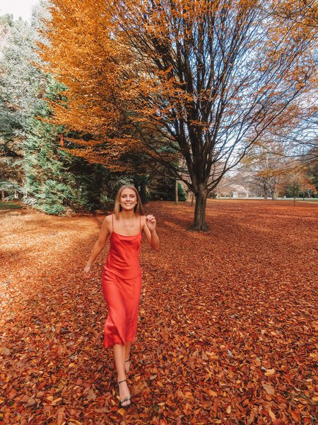 A bias cut red slip dress, featuring shoestring straps and a raw hemline.