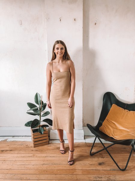 A simple slip dress with a straight cut neckline, non-adjustable shoestring straps and a side split. The fabric has a golden metallic woven into it for a glittering effect.