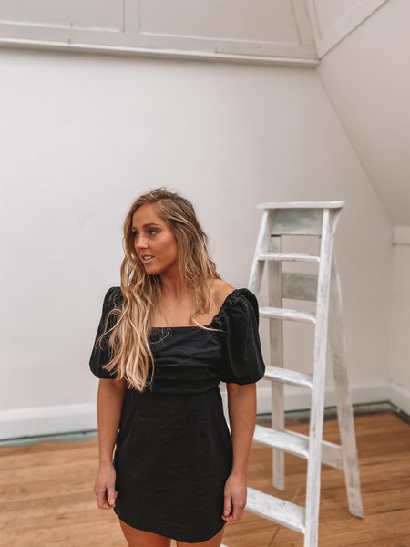 A cute linen mini. This piece features a square neckline, gathered short sleeves and a fitted design, with gathering throughout.