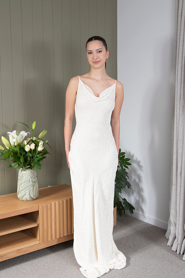 A beautiful full length and figure hugging gown with a small train, a cowl neck at the front across the bust and a slight low back, in a crushed velvet fabric with a leopard print. The dress is fully lined with a silk slip.