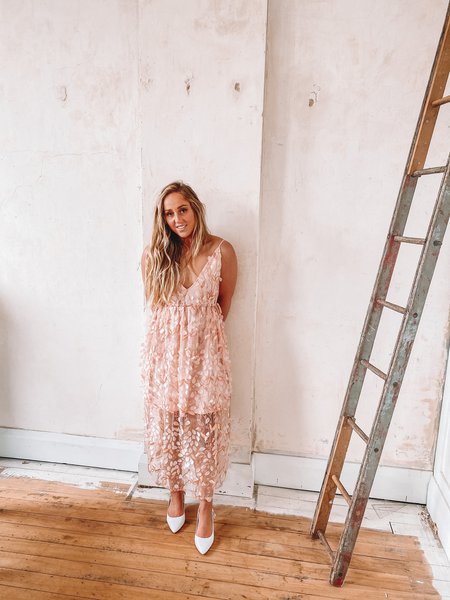 Made in rose gold sequin and blush coloured fabric with a textured leaf design. This piece cinches at the waist to fit and is lined to the knee. There are two splits at each side of the skirt and the straps are adjustable.