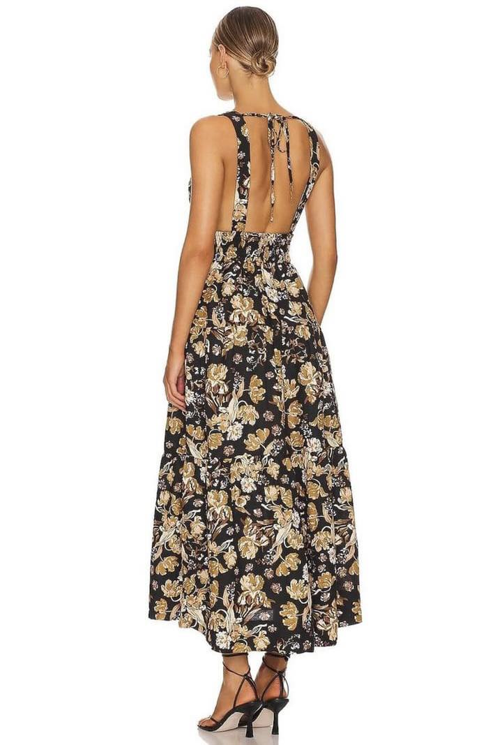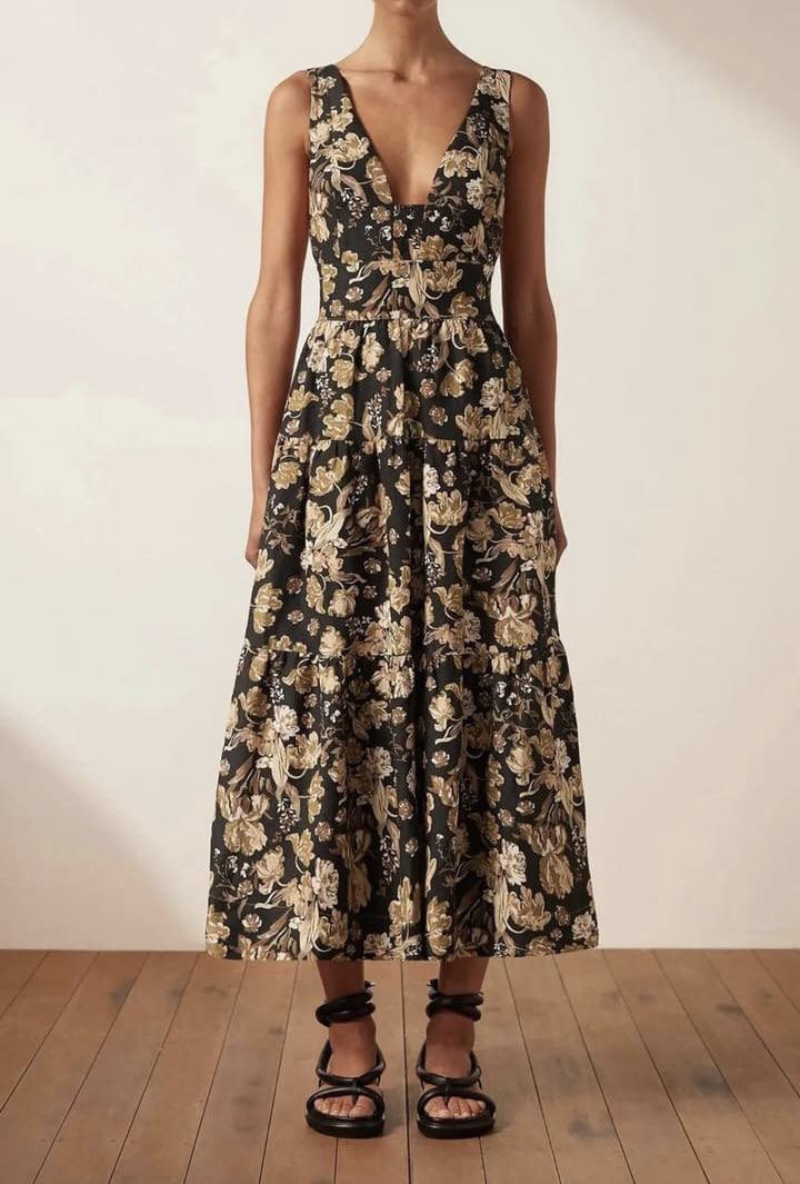 This piece features a fitted waistband, wide straps with a tie across the back and a tiered skirt in an exclusive Shona Joy print. The back of the waistband is shirred providing some stretch.