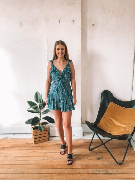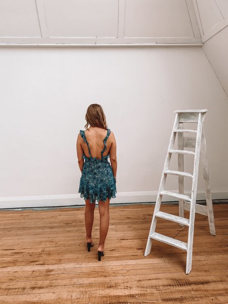 Featuring a low open back with a ruffle trim, hidden back zipper and tie closure. This dress is fully lined.