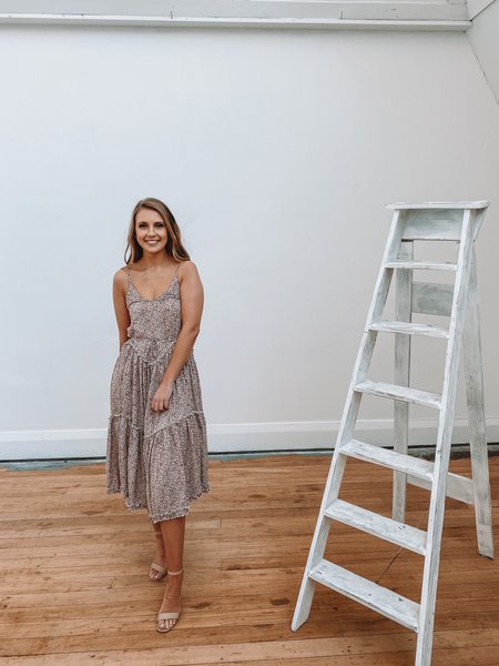 This sweet floral number features a V neckline, waist tie and flowing tiered skirt.