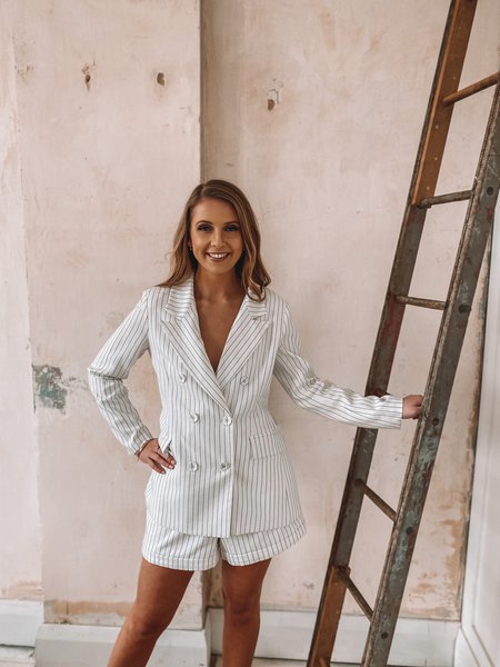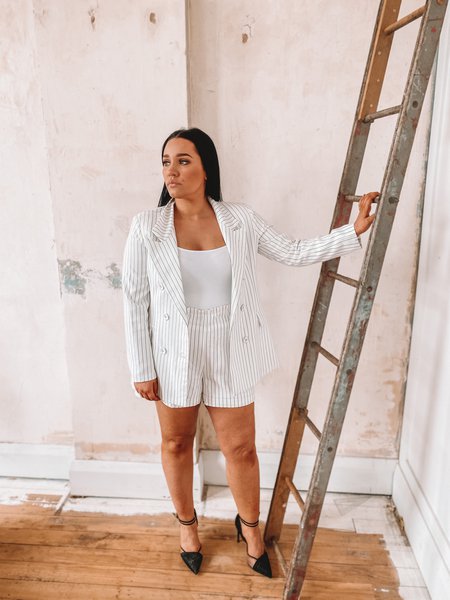 A blazer and shorts set. Featuring double breasted buttons and a pinstripe pattern.