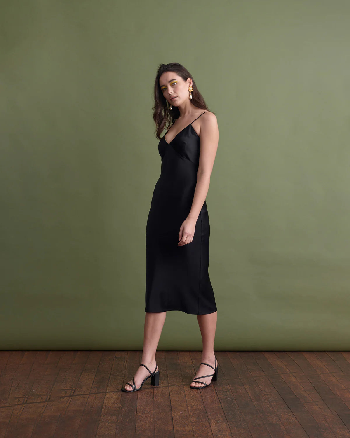 A lush piece that is iconic to the Liam brand. The Weirder slip is bias cut with a plunging neckline, crafted in a heavy weight double satin fabric. The colour of this piece is black.