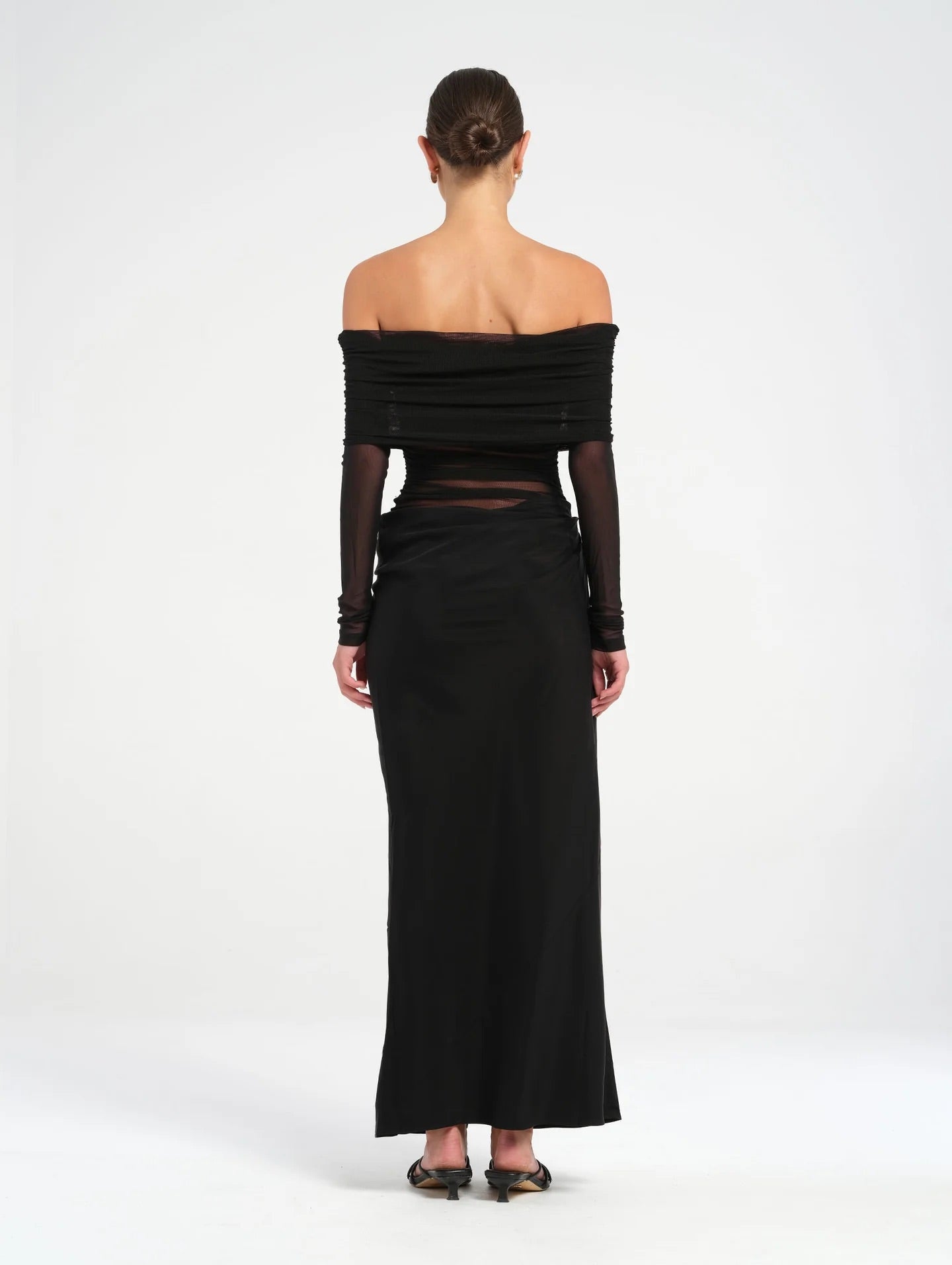 The Yasmin Maxi Dress from Benni features a beautiful off-shoulder design with a flattering cowl on the wearers left side waist. The overlapping skirt adds a touch of sophistication while the mesh bodice. Perfect for any special occasion